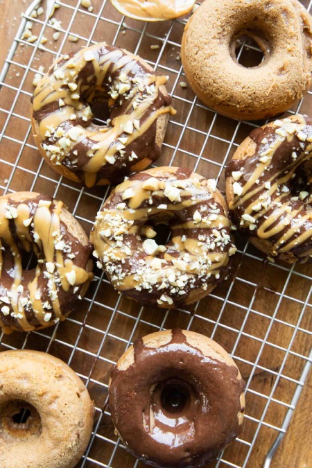 این دونات های سالم سبک، پف دار و سرشار از پروتئین هستند! سهولت تهیه آن ها (تنها ۲۵ دقیقه زمان پخت!) و این که تمام مواد در مخلوط کن ترکیب می شوند، واقعاً تحولی بزرگ است. این دونات ها با پنیر کاتیج تهیه شده و حاوی ۹ گرم پروتئین با بهترین بافت و طعم هستند! سال هاست که عاشق این دونات های شکلاتی با کره بادام زمینی به عنوان صبحانه یا میان وعده ای سالم هستم و هنوز هم یکی از دستورپخت های موردعلاقه ام محسوب می شوند.